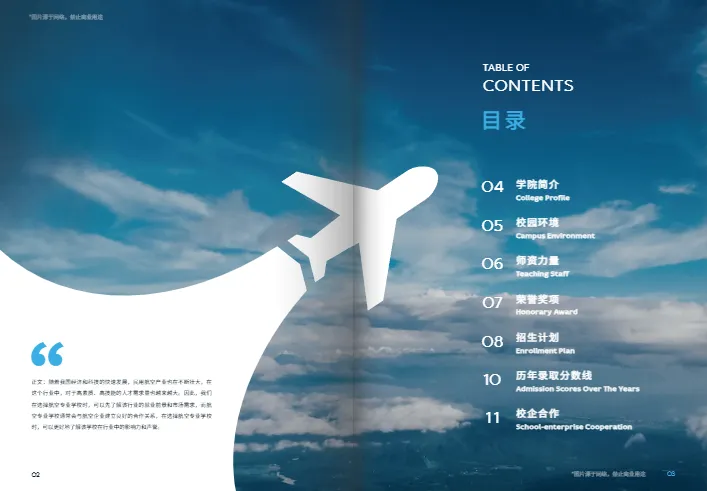 設(shè)計(jì)特色:突出專業(yè)特色,專門為飛行員、空乘等航空航天類專業(yè)設(shè)置了專屬介紹板塊,還搭配了機(jī)艙、航天設(shè)備等相關(guān)圖片,貼合院校專業(yè)定位。