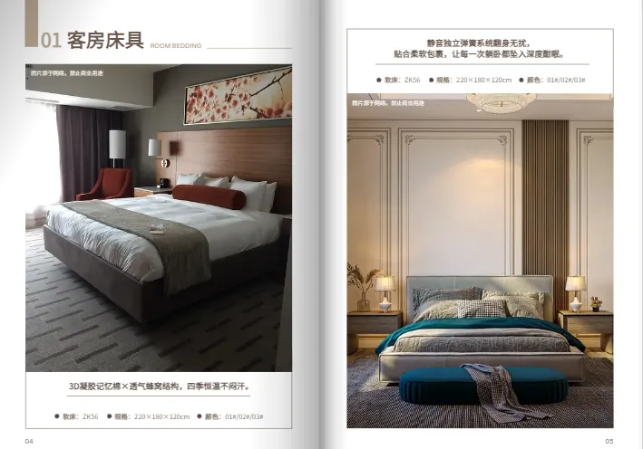 - 客房床具:重點展示多款酒店客房床具,包括軟床、靜音床墊等