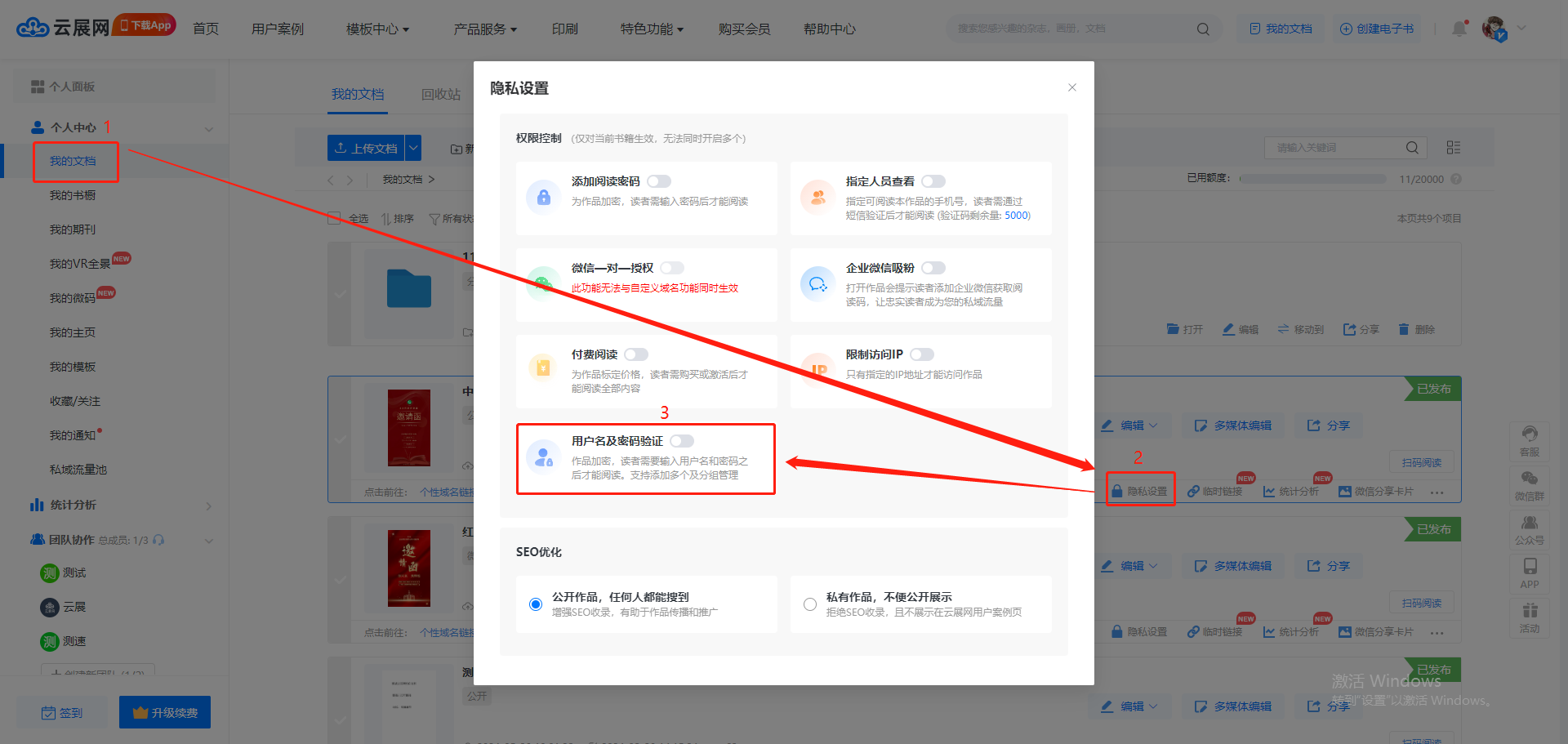 點(diǎn)擊【我的文檔】,選擇要設(shè)置的書(shū)本,點(diǎn)擊【隱私設(shè)置】,打開(kāi)【用戶名及密碼驗(yàn)證】。