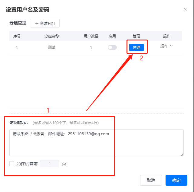 先在下方設(shè)置【訪問(wèn)提示】以及允許查看前幾頁(yè),然后點(diǎn)擊【管理】。