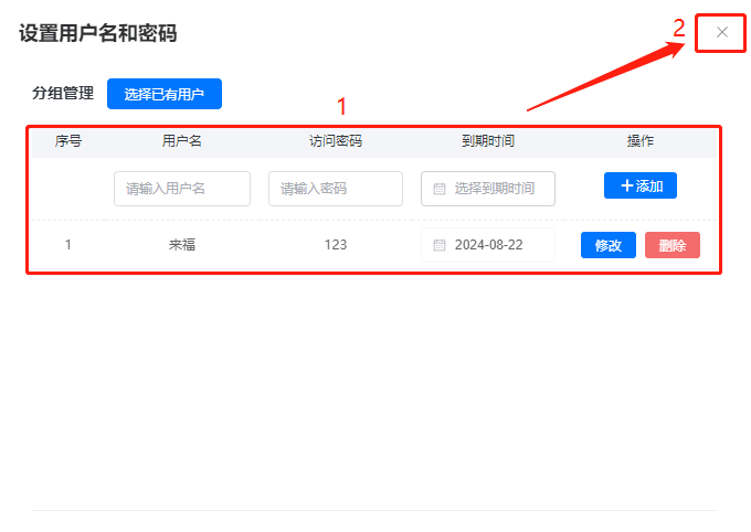 輸入【用戶名】、【密碼】,設(shè)置到期時(shí)間,點(diǎn)擊【添加】后,可以在下方看到創(chuàng)建好的用戶名和密碼,然后點(diǎn)擊右上角的【x】關(guān)閉界面。