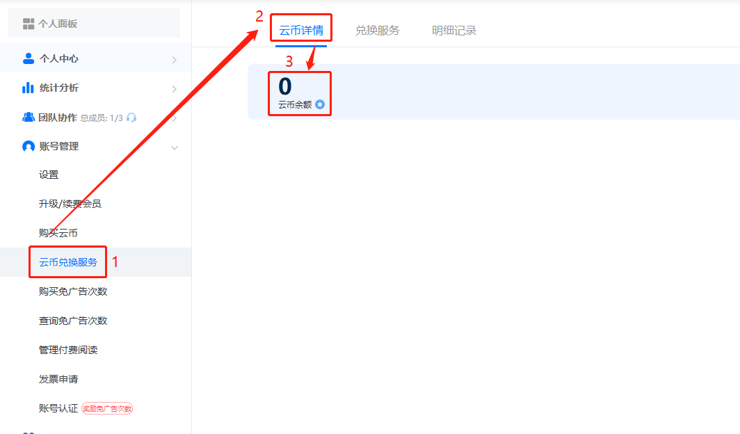點擊【云幣兌換服務(wù)】,再點擊【云幣詳情】,即可查看當前云幣余額。