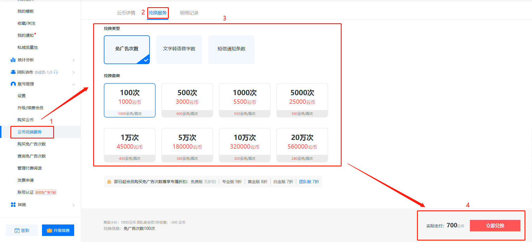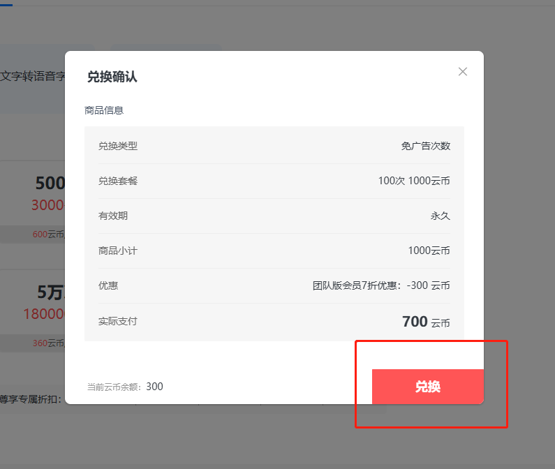 點擊【云幣兌換服務(wù)】,再點擊【兌換服務(wù)】,選擇需要的類型和套餐,然后右下方點擊立即兌換,最后點擊彈出的詳情框的兌換即可。