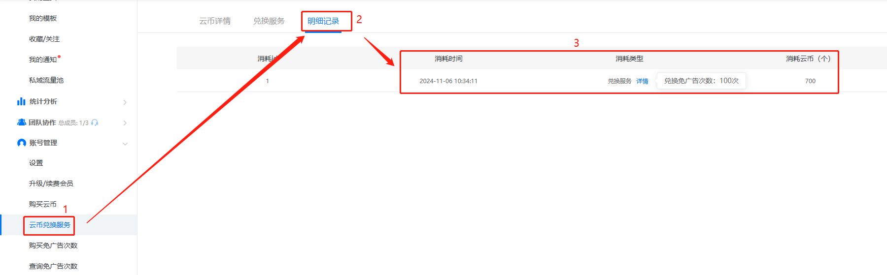 點擊【云幣兌換服務(wù)】,再點擊【明細記錄】,即可查看云幣兌換明細。