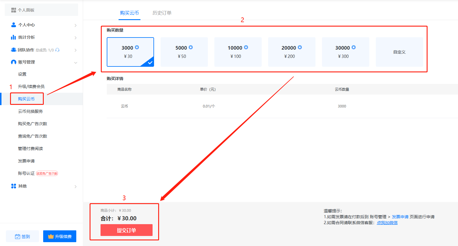 點擊【購買云幣】,選擇購買數(shù)量,下方提交訂單付款即可。