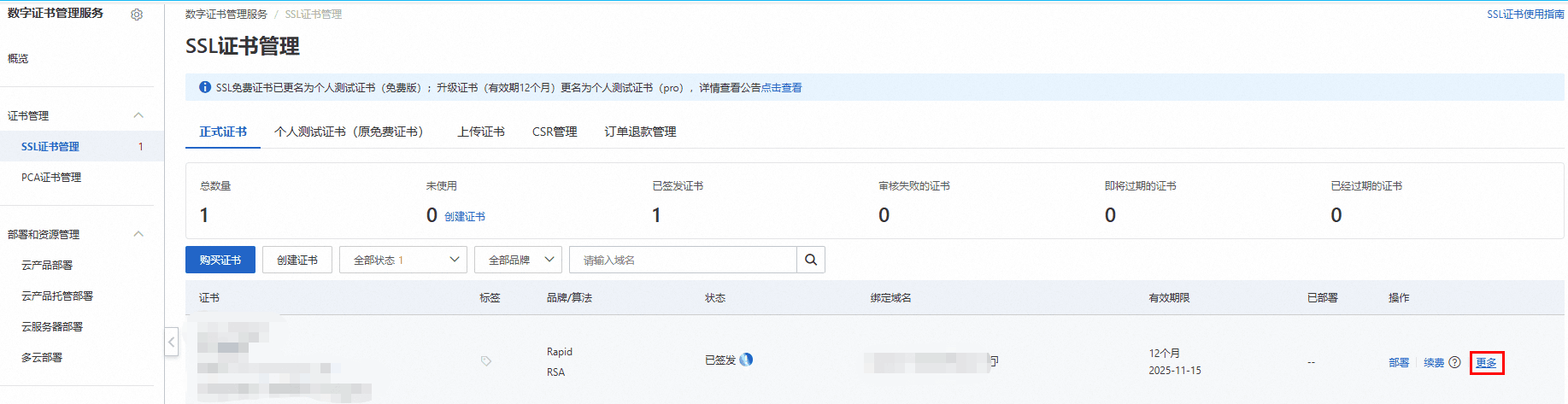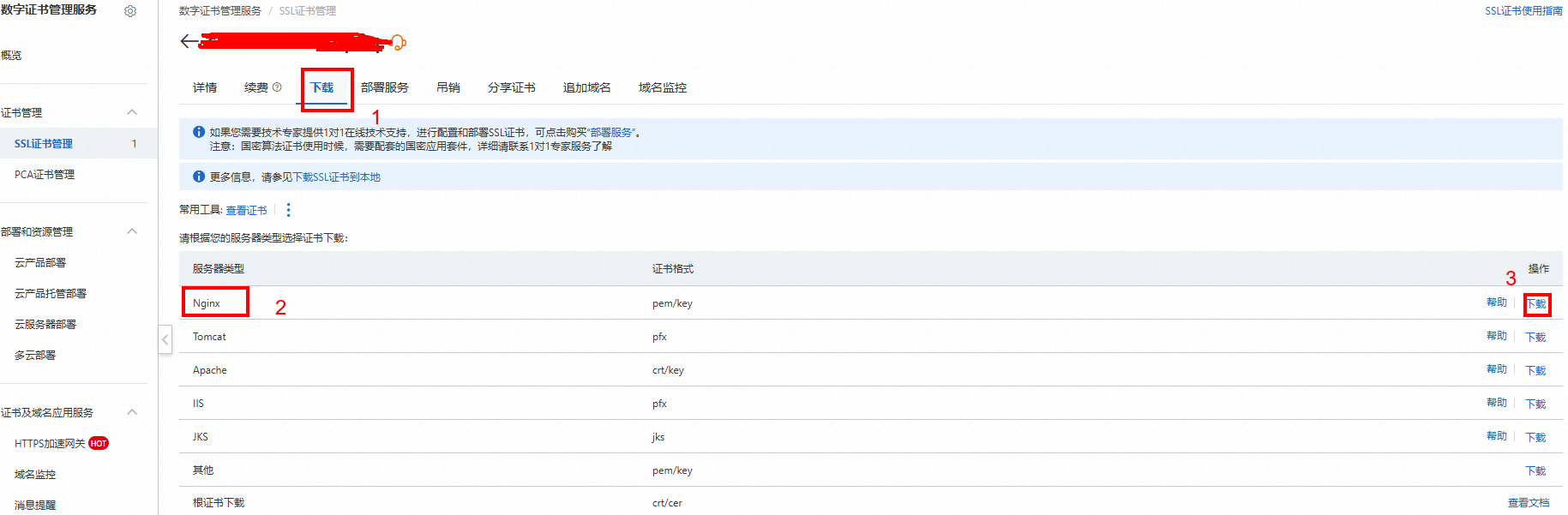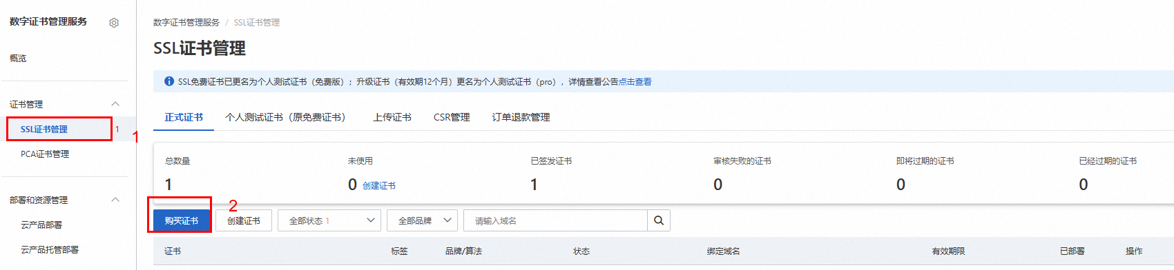 1)點擊左側(cè)欄的【SSL證書管理】,【購買證書】,如下圖: