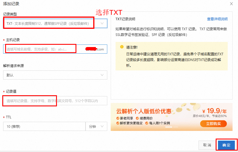 6)選擇TXT,并且填寫第二步復制的主機記錄以及記錄值,點擊【確定】