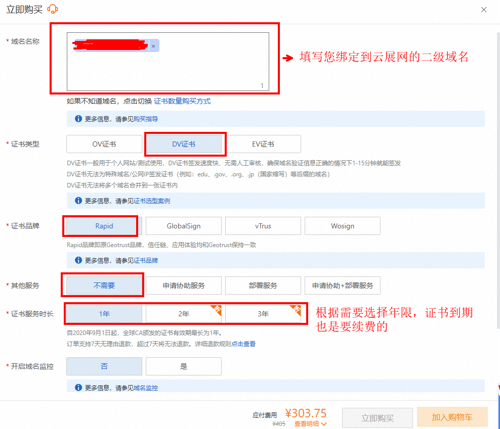 2)輸入二級域名,選擇DV證書,Rapid品牌等,加入購物車后。點擊立即購買付款