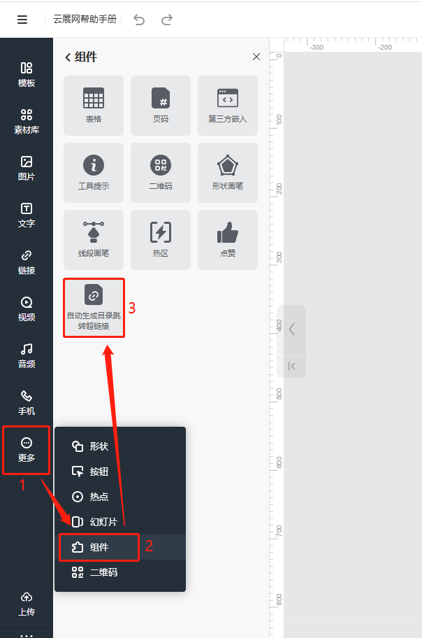 點(diǎn)擊【更多】,選擇【組件】,最后點(diǎn)擊【自動(dòng)生成目錄跳轉(zhuǎn)超鏈接】。