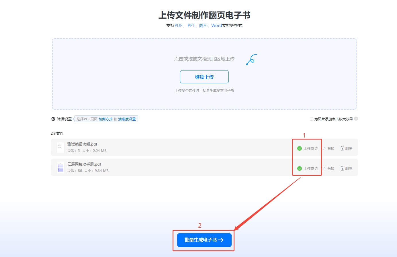當(dāng)顯示【上傳成功】時(shí),點(diǎn)擊下方【批量生成電子書(shū)】,電子書(shū)開(kāi)始生成。
