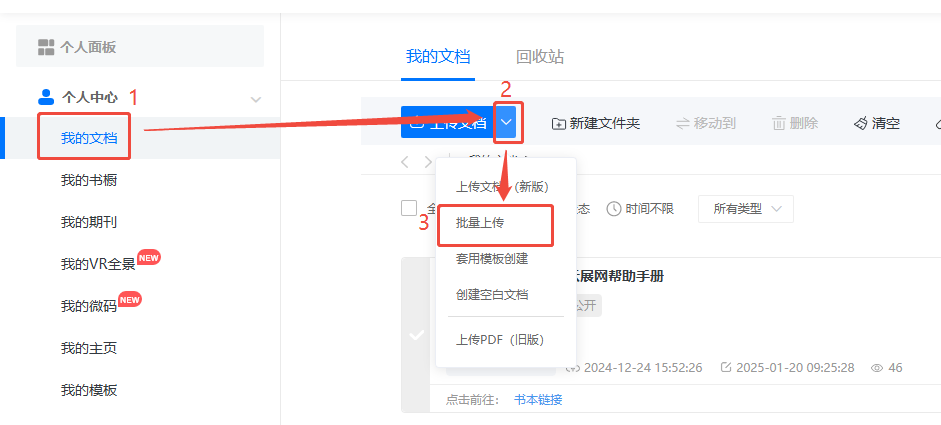 點(diǎn)擊【我的文檔】,然后點(diǎn)擊【批量上傳】,打開(kāi)批量上傳界面。