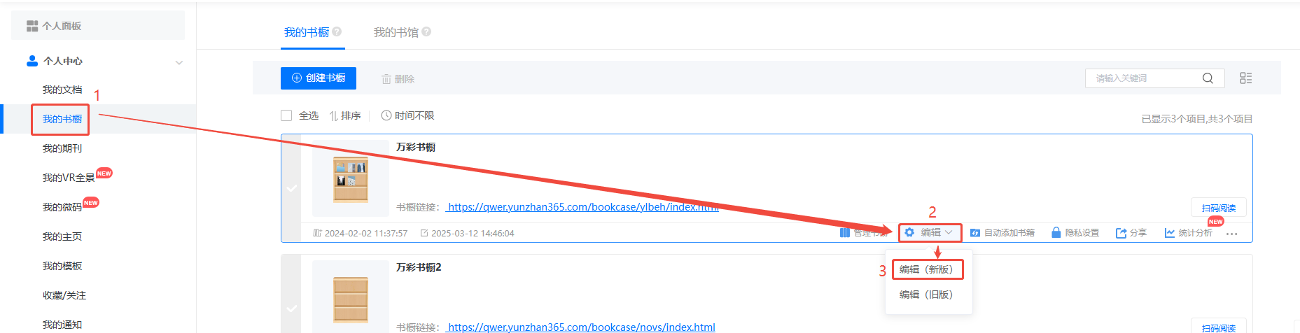 點擊【我的書櫥】,選擇要自定義分享配置的書櫥,點擊【編輯】,選擇【編輯(新版)】。