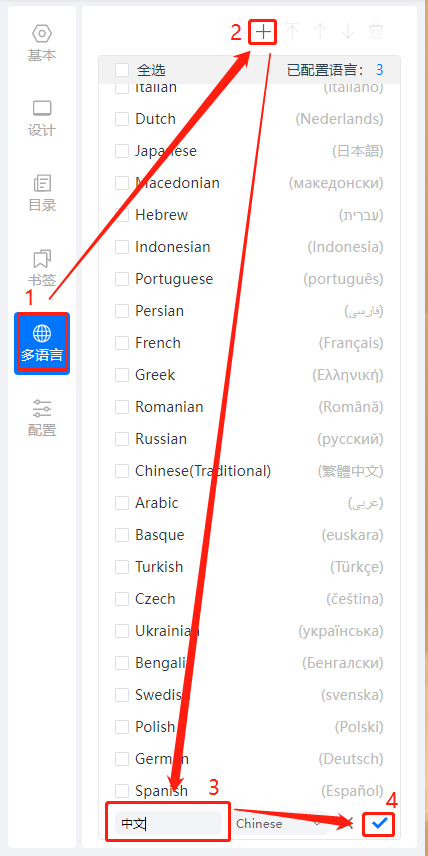如果您希望統(tǒng)一修改文字提示,直接選擇一個語言修改即可;如果您不希望這個修改應(yīng)用到所有書本,建議新建一個語言,下面以新建語言為例,點擊【多語言】,然后點擊【+】號,下方輸入名稱,再點擊【√】。