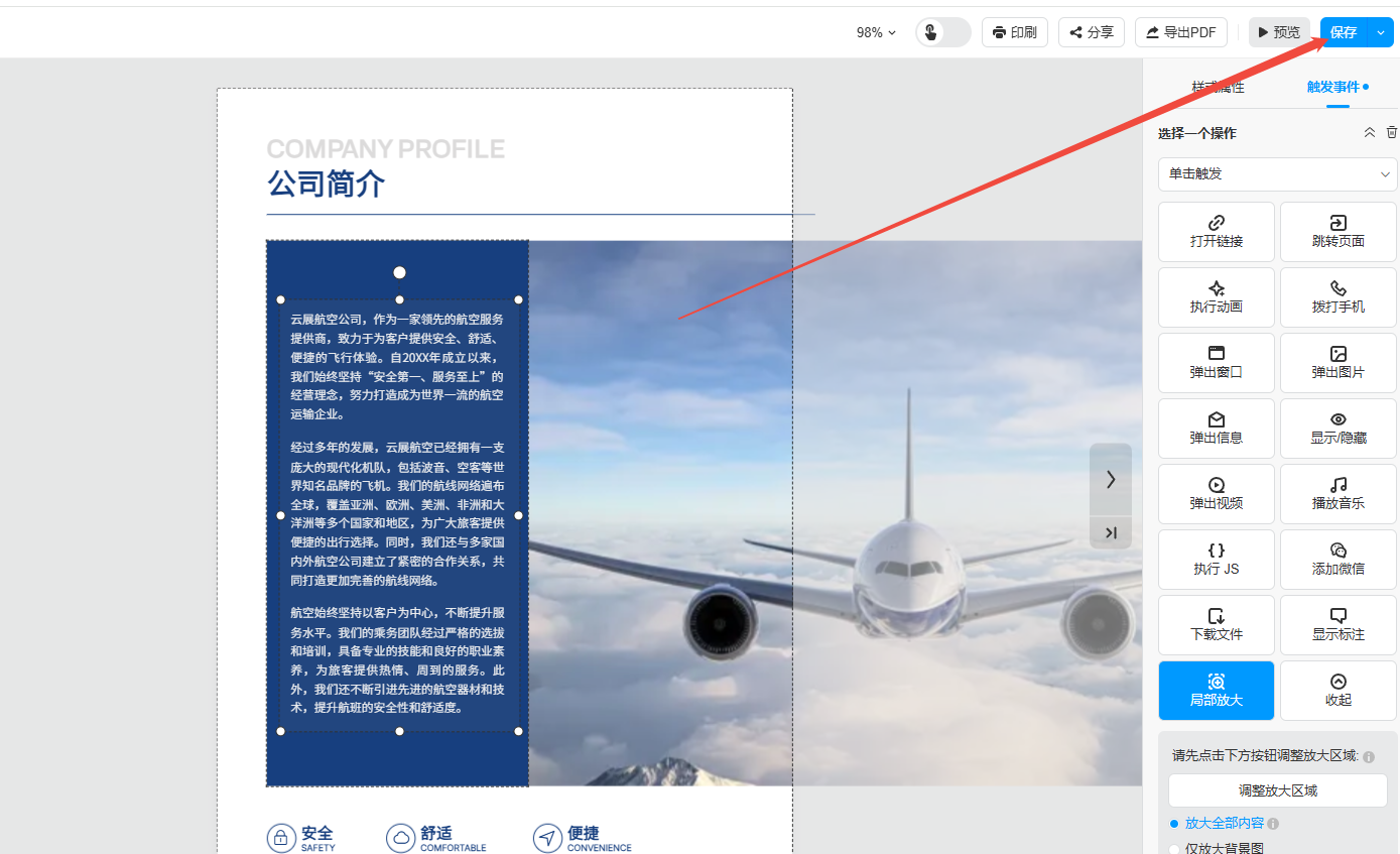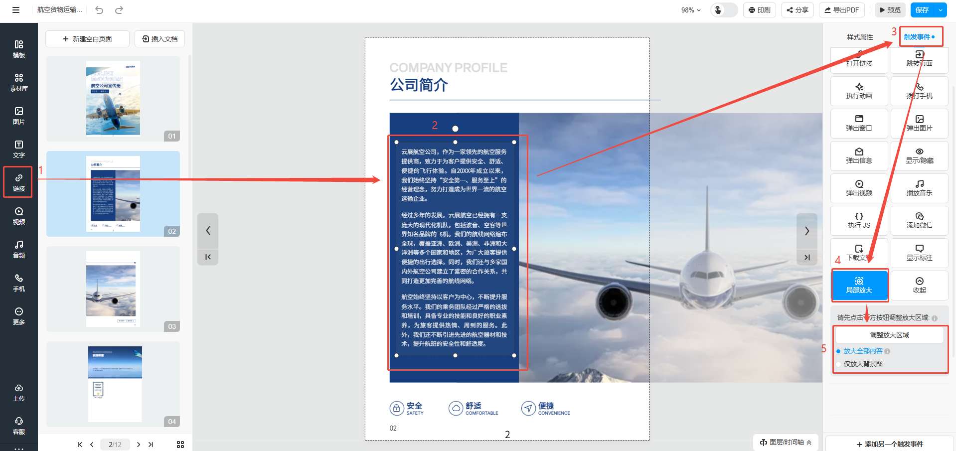 點擊【鏈接】,將鏈接框覆蓋到對應的位置,然后點擊【觸發(fā)事件】,選擇【局部放大】,點擊【調(diào)整放大區(qū)域】,選取需要放大的區(qū)域,選取之后選擇放大全部內(nèi)容或者僅放大背景圖。