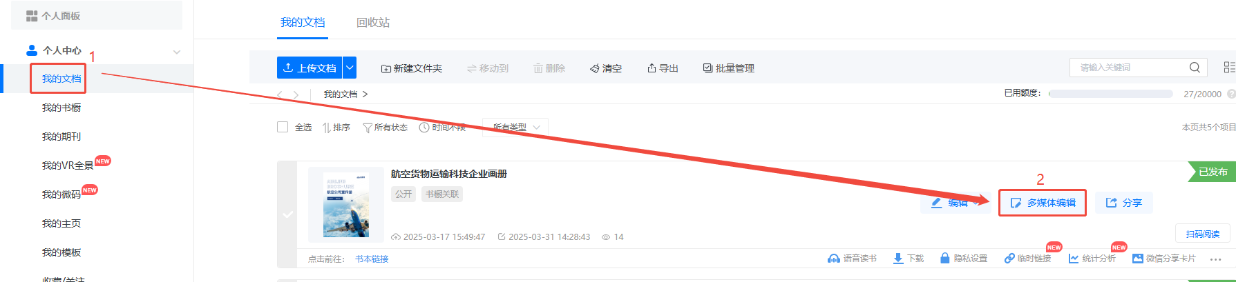 點進【我的文檔】/【文檔】,選擇對應電子書,點擊【多媒體編輯】/【內(nèi)容編輯】。