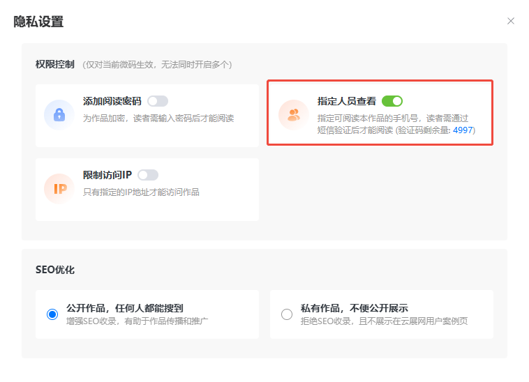 此功能可以后臺給微碼設(shè)置指定的手機(jī)號,然后讀者打開微碼后,需要通過指定的手機(jī)號收發(fā)驗證碼驗證后才可以觀看。