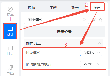 點擊【設(shè)計】,然后點擊【設(shè)置】,將【翻頁模式】和【移動端翻頁模式】改成文檔翻頁。