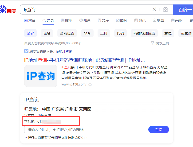 在電腦或者手機(jī)的瀏覽器上搜索【IP查詢(xún)】就可以獲取當(dāng)前的網(wǎng)絡(luò)IP地址。