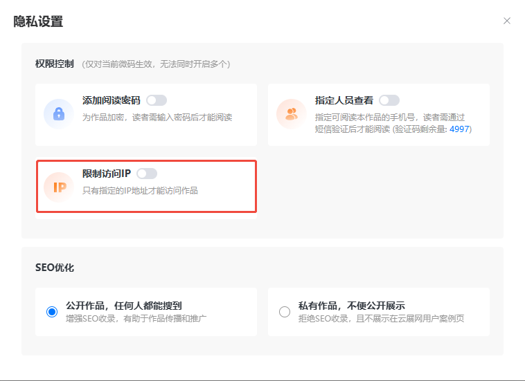 點(diǎn)擊【我的微碼】,選擇需要設(shè)置密碼的微碼,點(diǎn)擊【隱私設(shè)置】,打開(kāi)【限制訪(fǎng)問(wèn)IP】。