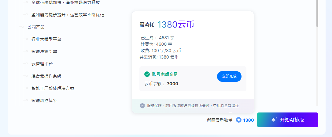收費(fèi)時(shí)機(jī): 大綱生成完成后,用戶瀏覽計(jì)費(fèi)明細(xì),點(diǎn)擊【開始AI排版】按鈕,即扣除云幣。