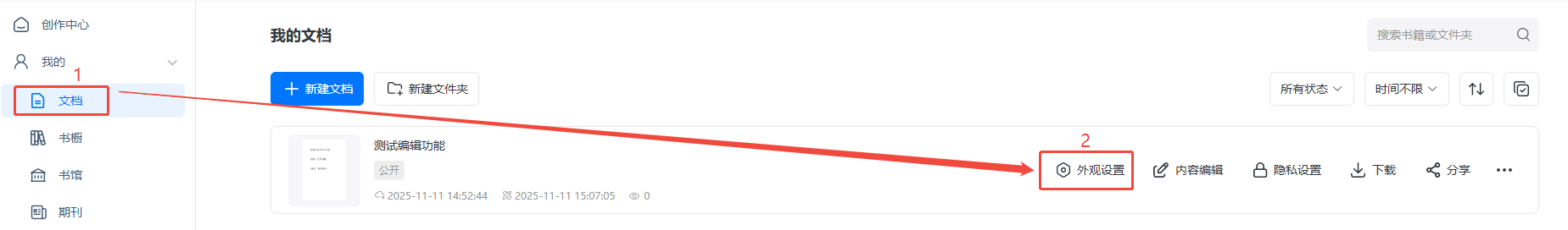 點擊【文檔】,找到對應電子畫冊,點擊【外觀設(shè)置】。