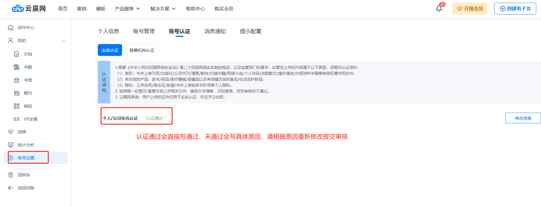 審核員都會審核您上傳的書本,如果要求您認證的話,登錄云展網(wǎng)后臺會有認證提示,您要在15天內(nèi)完成認證通過,否則書本會暫停訪問。你提交資料以后,我們會在1個工作日內(nèi)審核,審核結(jié)果可以在這里查看。