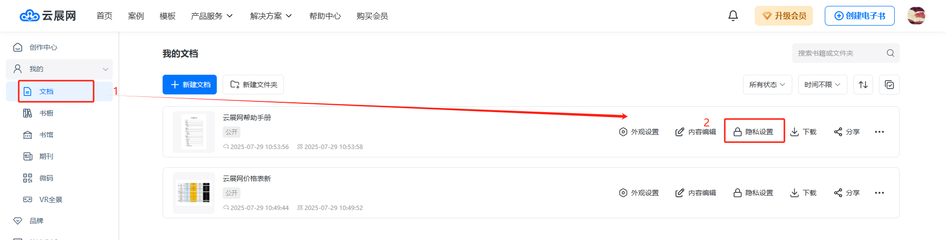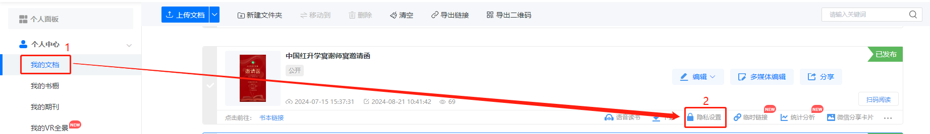 在【我的文檔】里找到要設(shè)置的電子雜志,點擊【隱私設(shè)置】。