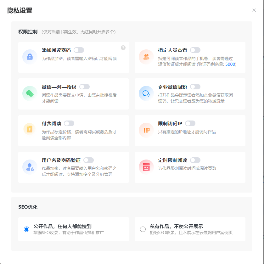 電子雜志隱私設(shè)置有10種:添加閱讀密碼、指定人員查看、企業(yè)微信吸粉、微信一對一授權(quán)閱讀、付費閱讀、限制訪問IP、用戶名及密碼驗證、定時限制閱讀、在云展網(wǎng)上私有、網(wǎng)站上公開。