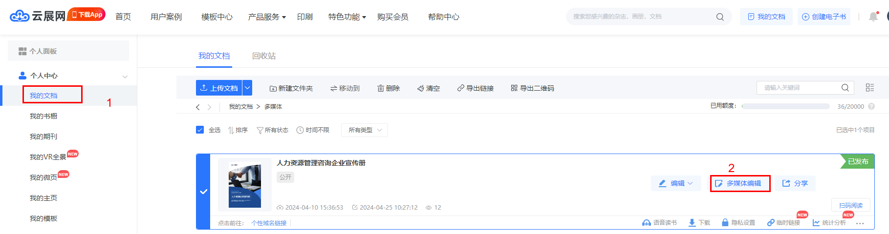 點進【我的文檔】/【文檔】,選擇對應電子書,點擊【多媒體編輯】/【內容編輯】。