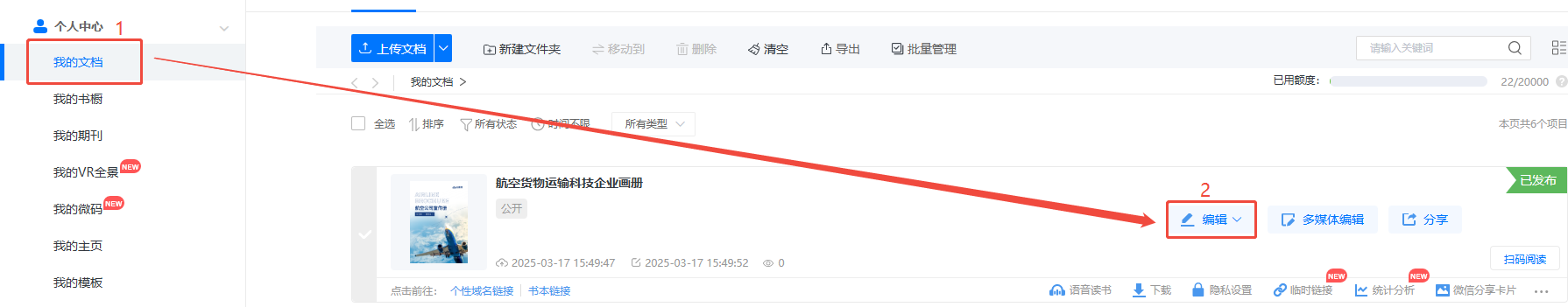 點(diǎn)擊【我的文檔】,然后點(diǎn)擊【編輯】,打開(kāi)編輯界面。