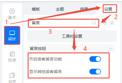 點(diǎn)擊【設(shè)計(jì)】,然后點(diǎn)擊【設(shè)置】,搜索欄搜索【留言】,將【開(kāi)啟讀者留言功能】和【顯示其他讀者留言】打開(kāi)。