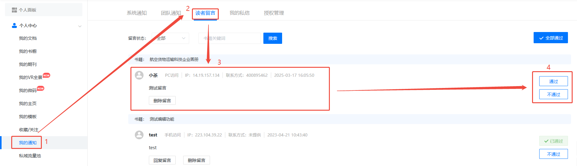 點(diǎn)擊【我的通知】,然后點(diǎn)擊【讀者留言】就可以看到讀者留下的留言,姓名,聯(lián)系方式,在右側(cè)選擇通過(guò)或者不通過(guò)。