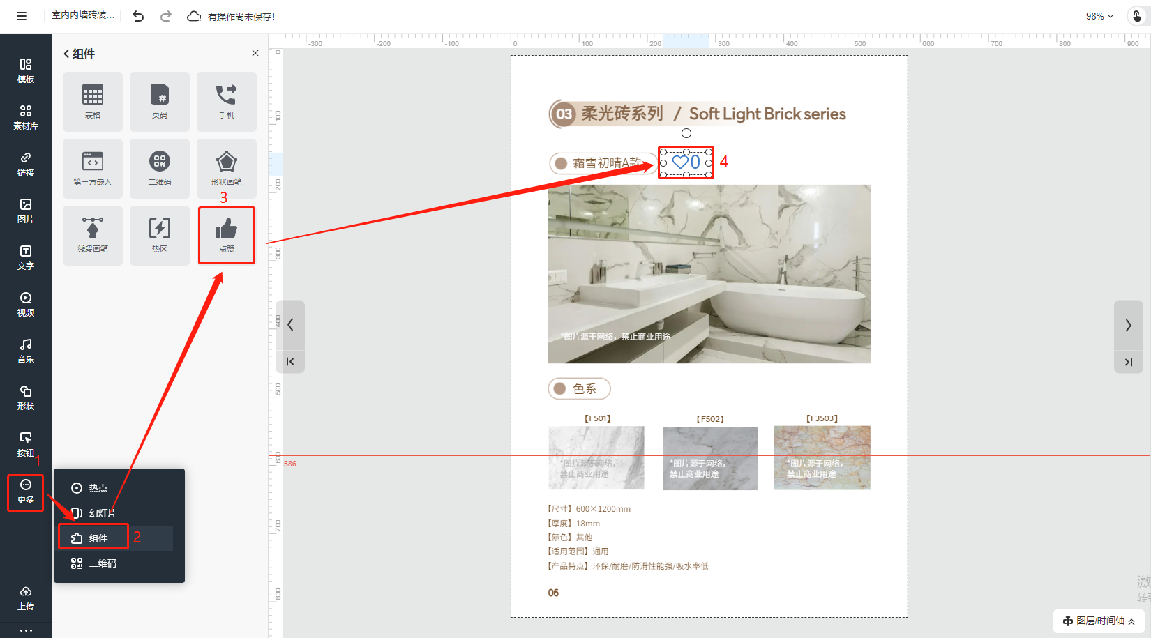 點擊【更多】,然后選擇【組件】,再點擊【點贊】,在頁面中會出現(xiàn)一個點贊按鈕,點擊可拖動調(diào)整位置。