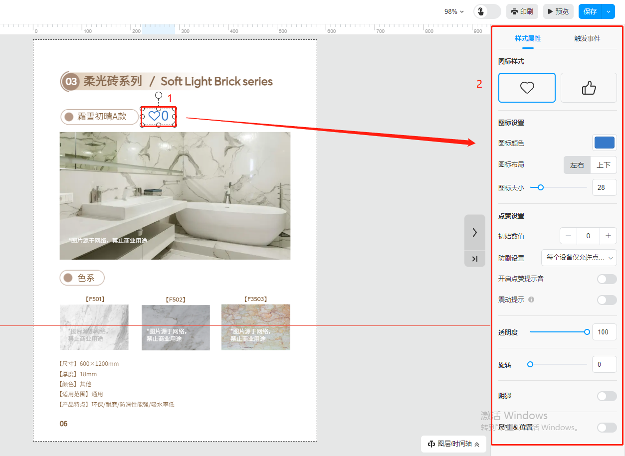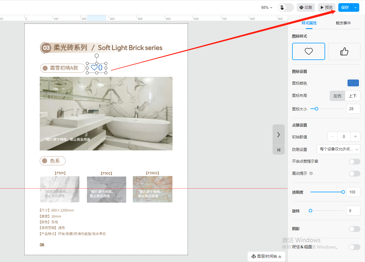 選中頁面上的點贊按鈕,設(shè)置點贊的樣式、透明度、位置和大小、旋轉(zhuǎn)。