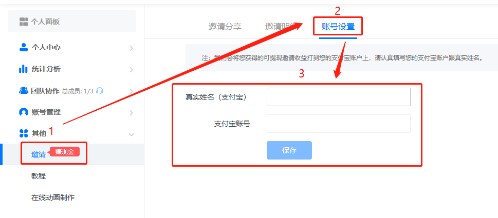 點(diǎn)擊【邀請(qǐng)】,然后點(diǎn)擊【賬號(hào)設(shè)置】,下方填寫(xiě)支付寶真實(shí)姓名和支付寶賬號(hào),并保存。