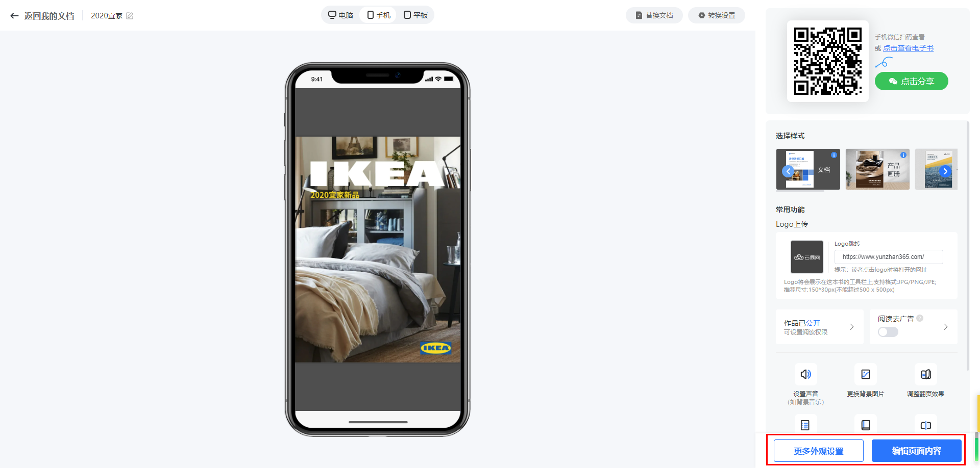 關(guān)于再次編輯雜志,在【文檔頁面】,點擊【外觀設(shè)置】按鈕,如圖操作:
