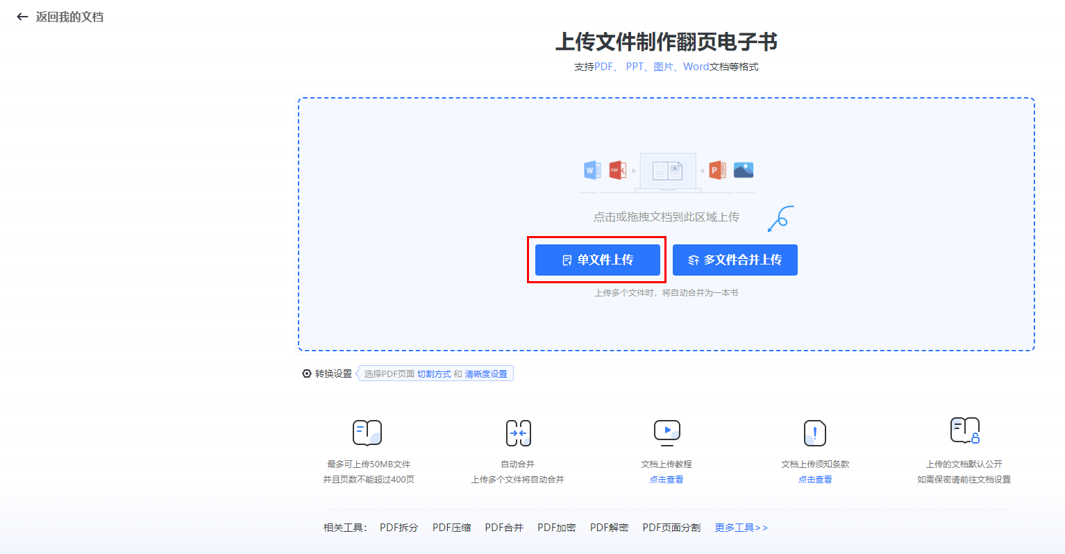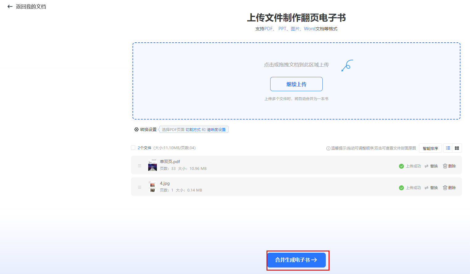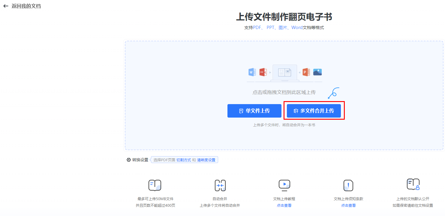 多個文件上傳合并為一個電子書,支持PDF/圖片/PPT/word格式。
