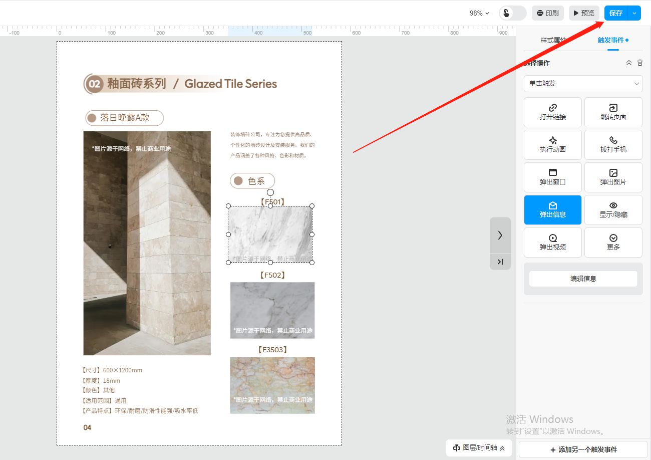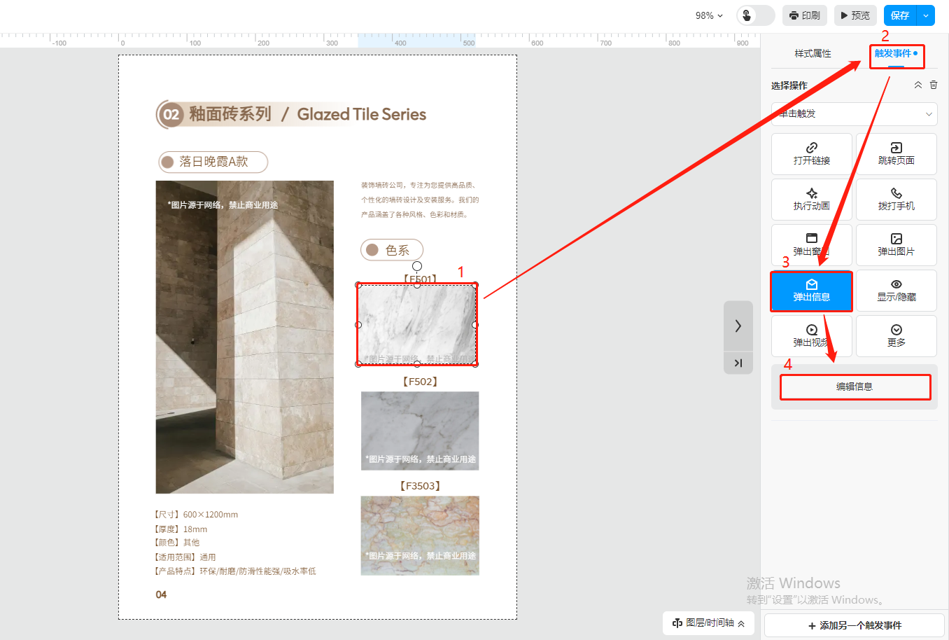 選中需要彈出信息的文字或者圖片,然后在【觸發(fā)事件】選擇【彈出信息】,點擊【編輯信息】。