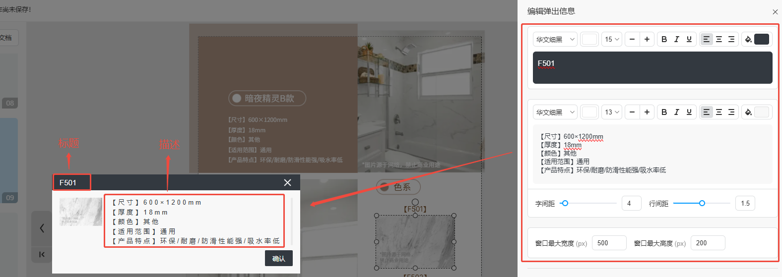 注意:標題和描述支持單獨對某個文字設置大小、顏色、加粗、斜體、下劃線等樣式。