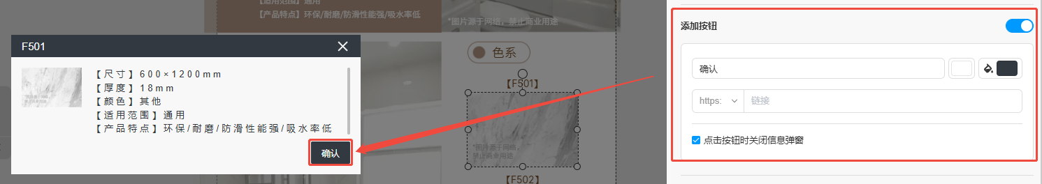 右側(cè)打開【添加按鈕】,輸入按鈕名稱和點擊按鈕跳轉(zhuǎn)的鏈接,調(diào)整文字樣式,按鈕背景色,勾選【點擊按鈕時關閉信息彈窗】。