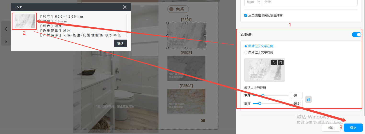 右側(cè)打開【添加圖片】,上傳圖片,設置顯示文字和調(diào)整大小,點擊右下角【確認】。