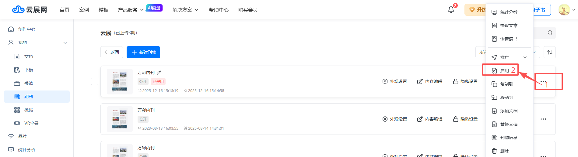 如果想晚點發(fā)布,可以先不點發(fā)布本期,確定發(fā)布了后,到【管理期刊】頁面,點擊右邊的【…】按鈕,點擊【啟用】。