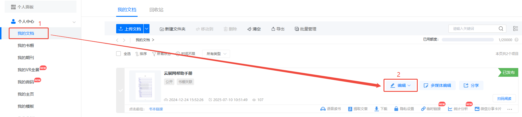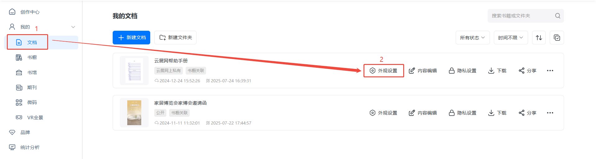 點擊【我的文檔】/【文檔】,點擊對應(yīng)書本的【編輯】/【外觀設(shè)置】。