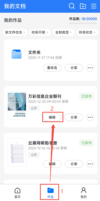 打開云展網(wǎng)app,點擊【作品】,然后點擊需要設置logo的書本的【編輯】。