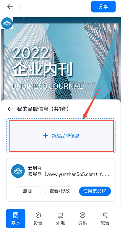 點擊【基本】,打開【顯示品牌信息】,然后點擊【點擊設置品牌信息】,最后點擊【新建品牌信息】。
