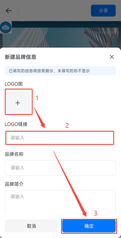 點擊【+】上傳logo圖,然后輸入擊logo時的跳轉鏈接,最后點擊【確定】。