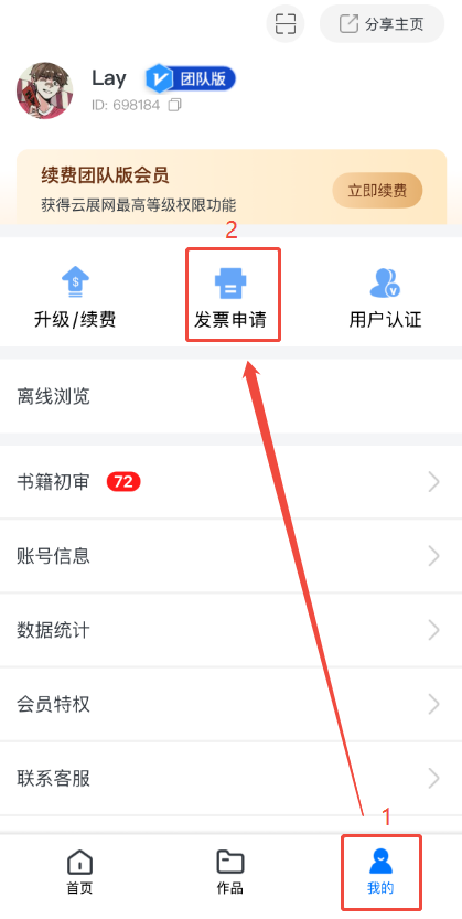 打開云展app,點(diǎn)擊【我的】,點(diǎn)擊【發(fā)票申請(qǐng)】進(jìn)入申請(qǐng)頁面。