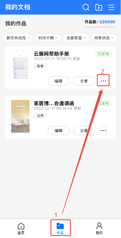 打開云展app,點擊【作品】,點擊書本旁邊三個點,然后點擊【隱私設(shè)置】。
