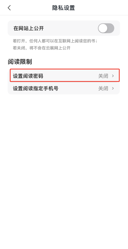 點擊【設(shè)置閱讀密碼】,將【開啟閱讀密碼】打開,在下方密碼框輸入密碼,可以輸入一個或者多個,也可以根據(jù)自己需要設(shè)置訪問提示,設(shè)置完點左上角箭頭退出即可。
