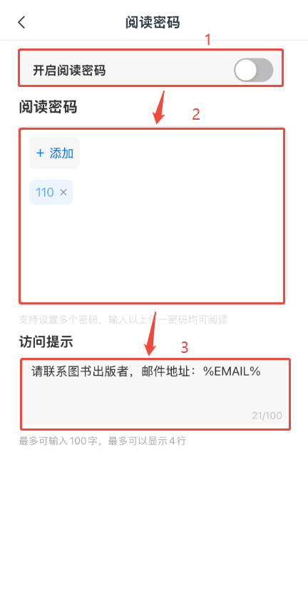 - 設(shè)置閱讀密碼:給書本設(shè)置一個或多個閱讀密碼,讀者需要輸入正確的密碼才可以閱讀。